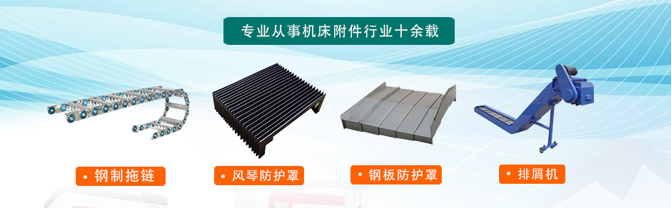 主要產品有:鋼板、不銹鋼板導軌防護罩、柔性風琴式導軌防護罩、不銹鋼片盔甲防護罩、伸縮式絲杠防護罩、油缸氣缸保護套、螺旋鋼帶保護套、卷簾伸縮防護罩、鋁型材防護簾、排屑機、機床工作燈、機床墊鐵、可調塑料冷卻管、金屬冷卻管、機床導軌刮屑板、T型撞塊槽板、塑料法蘭蓋、鋼管護帽等產品。
